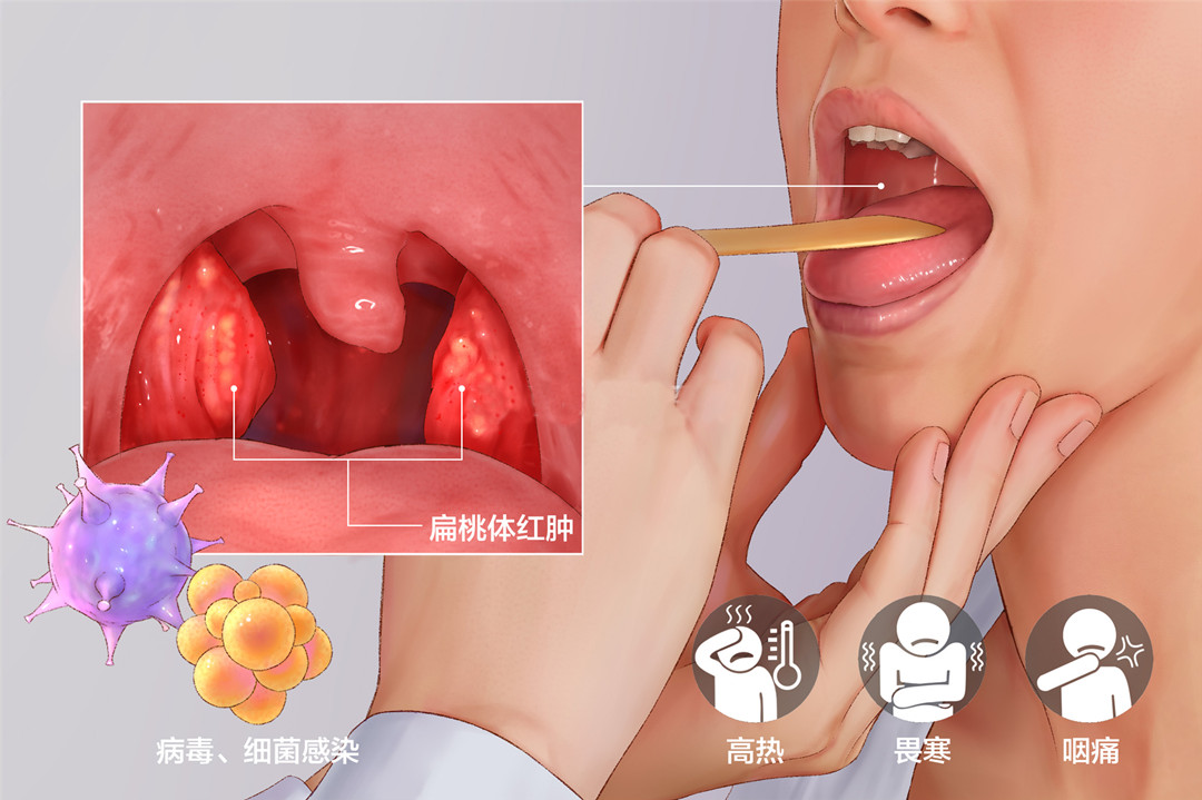 急性扁桃体炎的典型症状是发烧(体温常达38.5℃以上)、剧烈咽痛、吞咽困难,检查可见咽喉黏膜充血红肿,扁桃体表面甚至出现白色或黄色脓点(化脓性扁桃体炎)。若这种情况每年发作34次以上,且连续出现2年,就属于“反复发作型”,不建议继续保守治疗:
