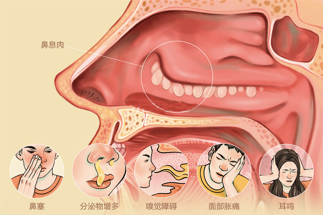 因鼻腔通气受阻,患者常夜间张口呼吸、打鼾,儿童还可能出现睡眠不安、憋气、白天嗜睡;
