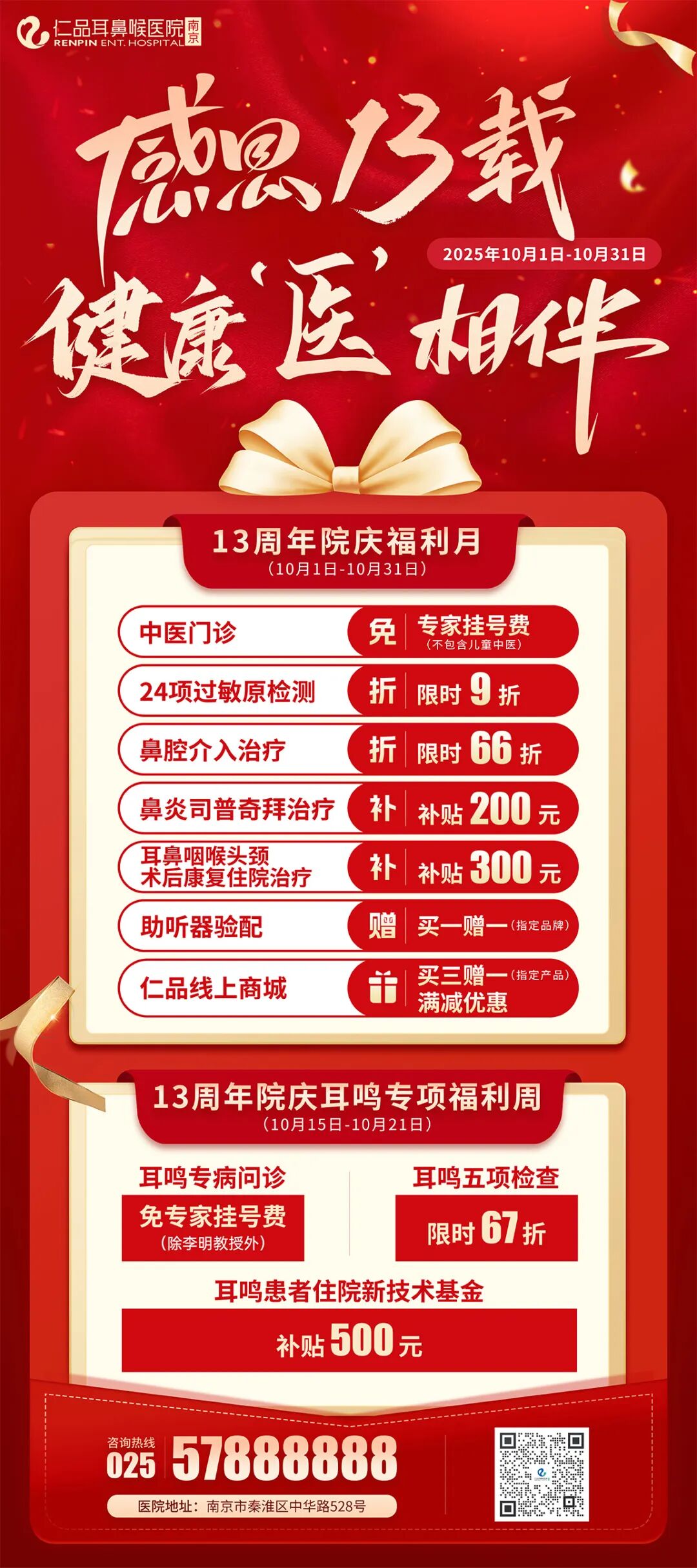 金秋十月,感恩同行!2025年10月18日,南京仁品耳鼻喉专科医院将迎来建院13周年的重要时刻。为了回馈广大患者和社会各界多年来的信任与支持,医院以“感恩十三载,健康‘医’相伴”为主题,重磅推出为期一个月的院庆系列活动与惠民福利,通过专属优惠、专项帮扶、健康分享等形式,为广大市民送上实实在在的健康关怀。