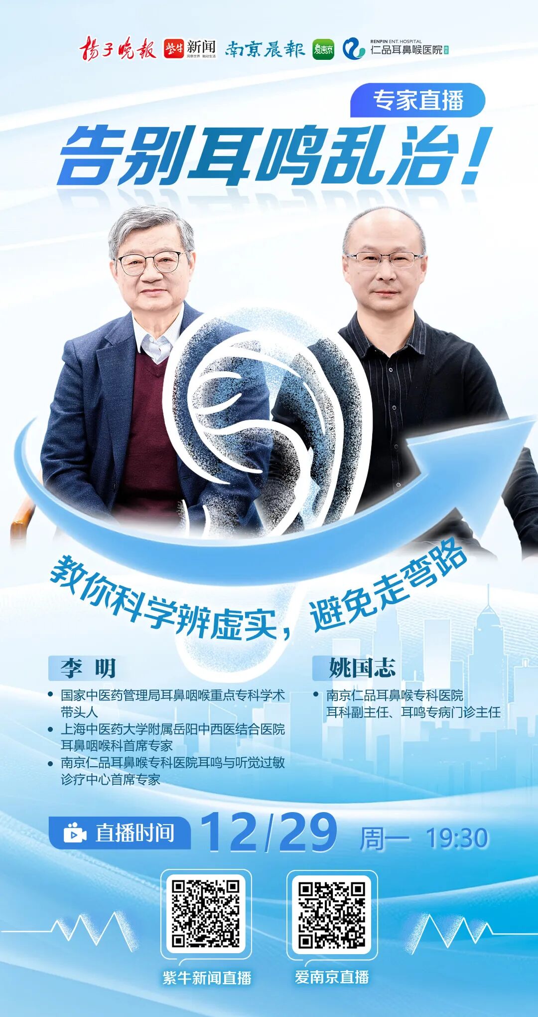 无论你是长期受耳鸣困扰的患者,还是身边有耳鸣人群的亲友,这场直播都能为你带来权威、实用的指导。12月29日(周一)19:30,锁定紫牛新闻直播、爱南京直播,跟着专家一起告别耳鸣乱治,走上科学应对的正轨!